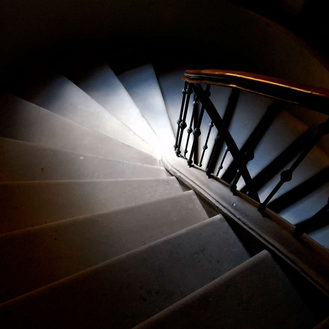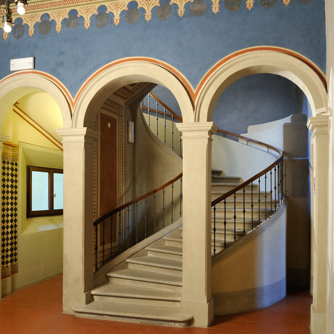 In alto la parete è azzurra; e vi corre una cornice dipinta ad architetti tribolati. La splendida curva della scala, la cui dinamica rimanda al Liberty, occupa un vano decorato con motivi geometrici monocromi.